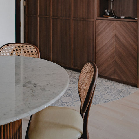 Dining area. The arched design feature in the dining area adds a touch of timeless elegance, gracefully framing the coffee nook where the owners begin their day. This carefully crafted curve creates a cozy, inviting space where the ritual of making coffee becomes a daily delight.