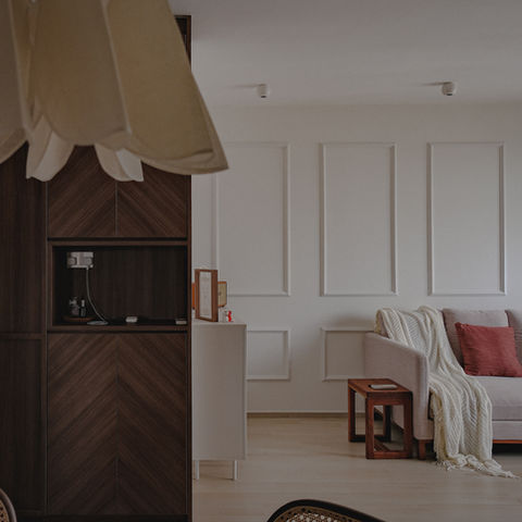 Living room with accent wall. The feature wall with subtle paneling enhances the room's sophistication, while the dark wood cabinets add a touch of contrast, creating a perfect balance between light and dark elements.