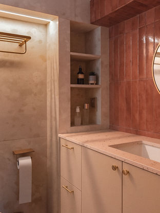 For hers. A blend of pink-toned tiles and terrazzo textures for a soft, feminine touch.
